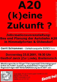 7.8.2001: Der Umweltausschuß der Samtgemiene Himmelpforten beriet zurA20. Der Sprecherkreis der BI und einige Mitglieder waren dabei. Die Haltung des Umweltausschusses war enttäuschend und nicht nachvollziehbar.......... |